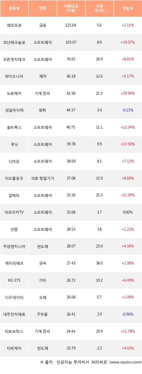 외국인 투자자의 순매수 상위 20개 종목은 에코프로, 코난테크놀로지, 오픈엣지테크놀로지, 바이오니아, 뉴로메카, 성일하이텍, 솔트룩스, 루닛, 디어유, 이오플로우등이다.