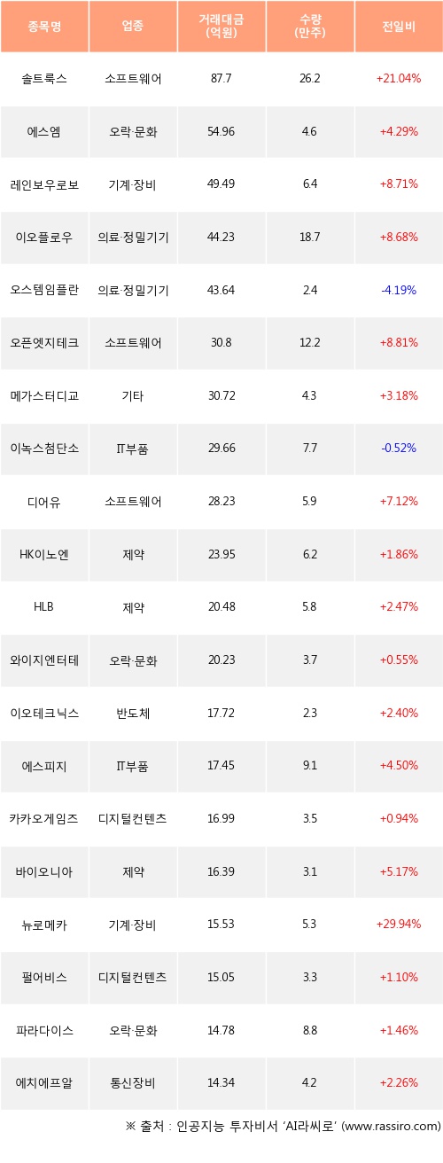 솔트룩스, 에스엠, 레인보우로보틱스 등은 전일 대비 주가가 상승했고, 오스템임플란트, 이녹스첨단소재 등은 주가가 하락했다.