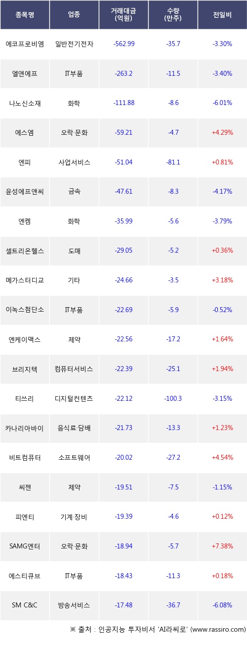 외국인 투자자의 순매도 상위 20개 종목은 에코프로비엠, 엘앤에프, 나노신소재, 에스엠, 엔피, 윤성에프앤씨, 엔켐, 셀트리온헬스케어, 메가스터디교육, 이녹스첨단소재등이다.