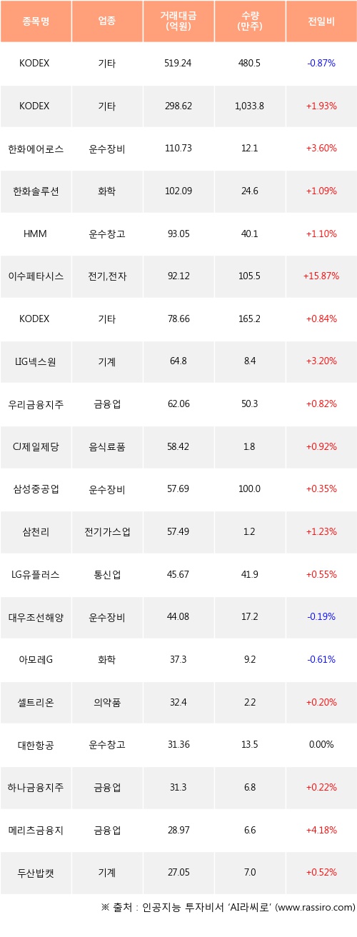 KODEX 200선물인버스2X, 한화에어로스페이스, 한화솔루션 등은 전일 대비 주가가 상승했고, KODEX 200TR, 대우조선해양, 아모레G 등은 주가가 하락했다.