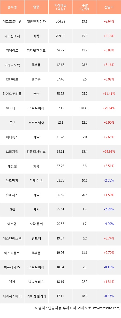 에코프로비엠, 나노신소재, 위메이드 등은 전일 대비 주가가 상승했고, 뉴로메카, 휴젤, 에스엠 등은 주가가 하락했다.