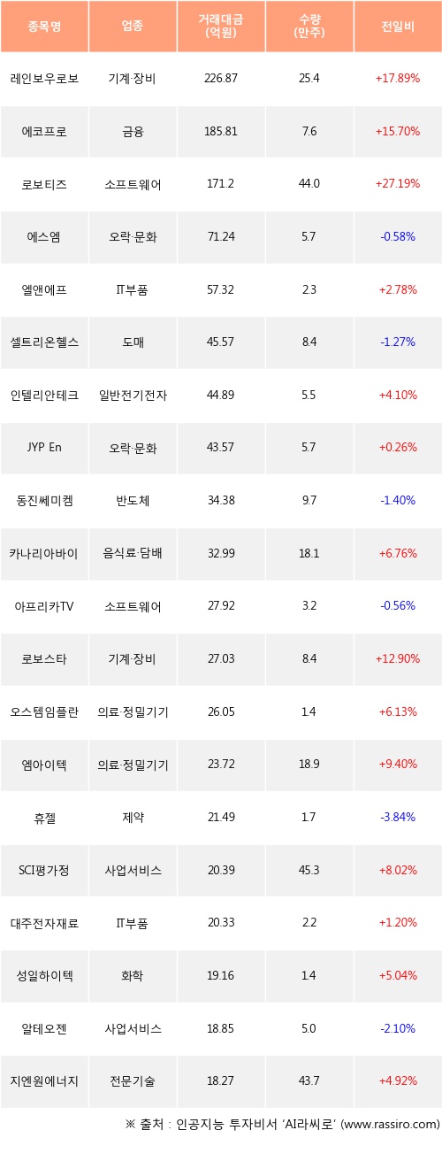 레인보우로보틱스, 에코프로, 로보티즈 등은 전일 대비 주가가 상승했고, 에스엠, 셀트리온헬스케어, 동진쎄미켐 등은 주가가 하락했다.