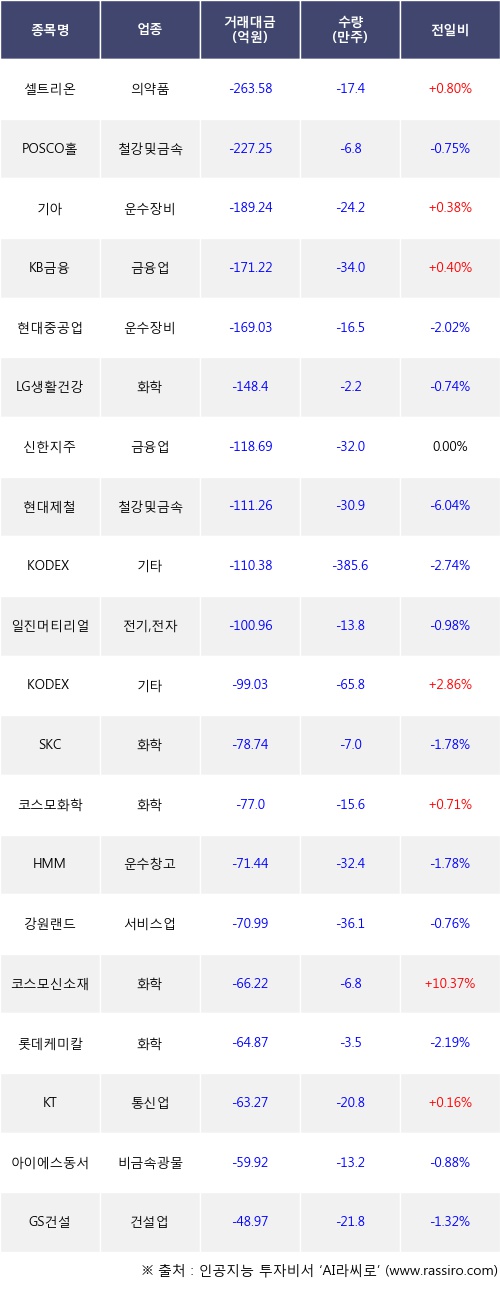 외국인 투자자의 순매도 상위 20개 종목은 셀트리온, POSCO홀딩스, 기아, KB금융, 현대중공업, LG생활건강, 신한지주, 현대제철, KODEX 200선물인버스2X, 일진머티리얼즈등이다.