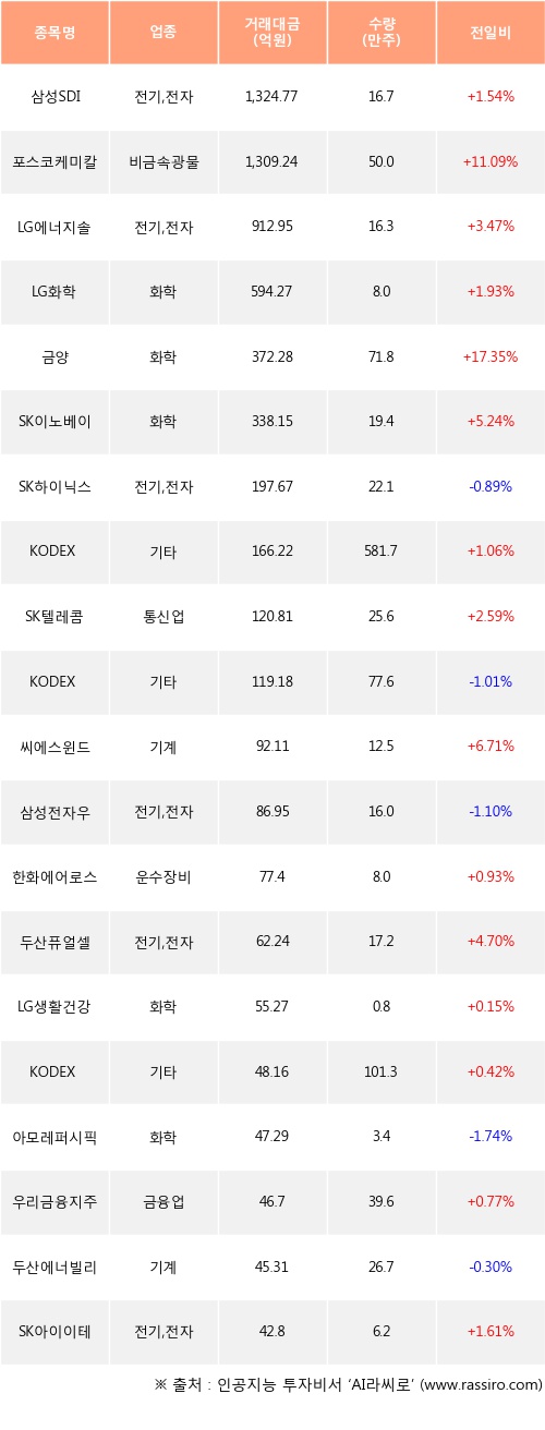 삼성SDI, 포스코케미칼, LG에너지솔루션 등은 전일 대비 주가가 상승했고, SK하이닉스, KODEX 레버리지, 삼성전자우 등은 주가가 하락했다.