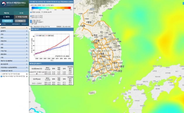 국립해양조사원은 한국 주변 해역의 미래 해수면 상승 전망 정보를 9일부터 국립해양조사원 홈페이지 '바다누리 해양정보 소비스'를 통해 국내 최초로 제공한다.