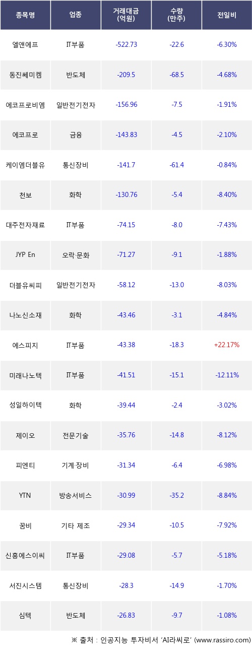 기관 투자자의 순매도 상위 20개 종목은 엘앤에프, 동진쎄미켐, 에코프로비엠, 에코프로, 케이엠더블유, 천보, 대주전자재료, JYP Ent., 더블유씨피, 나노신소재등이다.