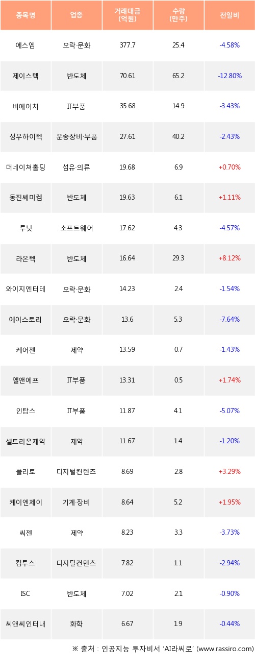 기관 투자자의 순매수 상위 20개 종목은 에스엠, 제이스텍, 비에이치, 성우하이텍, 더네이쳐홀딩스, 동진쎄미켐, 루닛, 라온텍, 와이지엔터테인먼트, 에이스토리등이다.