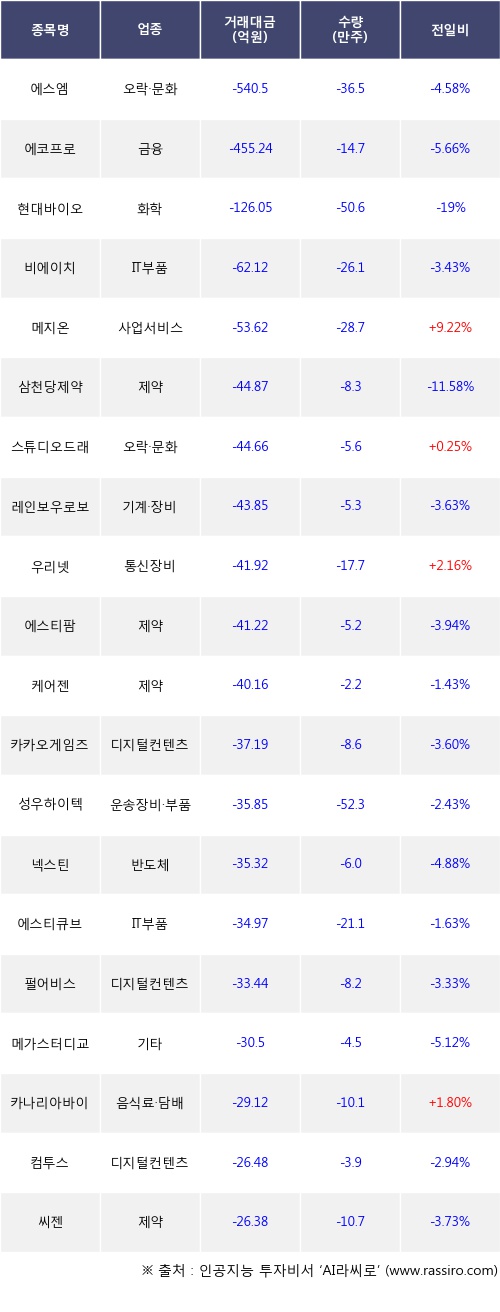 외국인 투자자의 순매도 상위 20개 종목은 에스엠, 에코프로, 현대바이오, 비에이치, 메지온, 삼천당제약, 스튜디오드래곤, 레인보우로보틱스, 우리넷, 에스티팜등이다.
