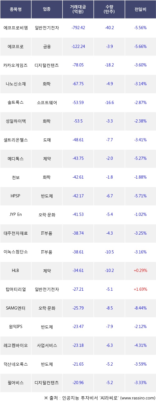 기관 투자자의 순매도 상위 20개 종목은 에코프로비엠, 에코프로, 카카오게임즈, 나노신소재, 솔트룩스, 성일하이텍, 셀트리온헬스케어, 메디톡스, 천보, HPSP등이다.
