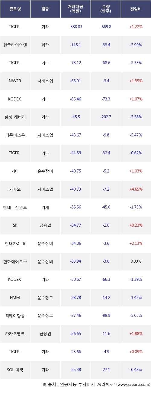 기관 투자자의 순매도 상위 20개 종목은 TIGER MSCI Korea TR, 한국타이어앤테크놀로지, TIGER 차이나전기차SOLACTIVE, NAVER, KODEX 미국채울트라30년선물(H), 삼성 레버리지 천연가스 선물 ETN B, 더존비즈온, TIGER 미국S&P500, 기아, 카카오등이다.