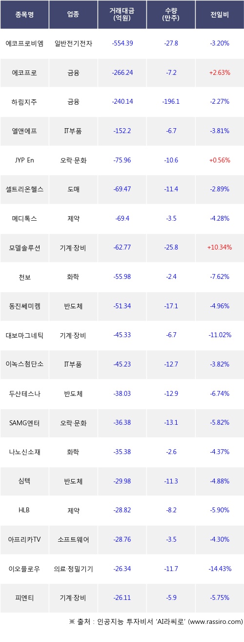기관 투자자의 순매도 상위 20개 종목은 에코프로비엠, 에코프로, 하림지주, 엘앤에프, JYP Ent., 셀트리온헬스케어, 메디톡스, 모델솔루션, 천보, 동진쎄미켐등이다.