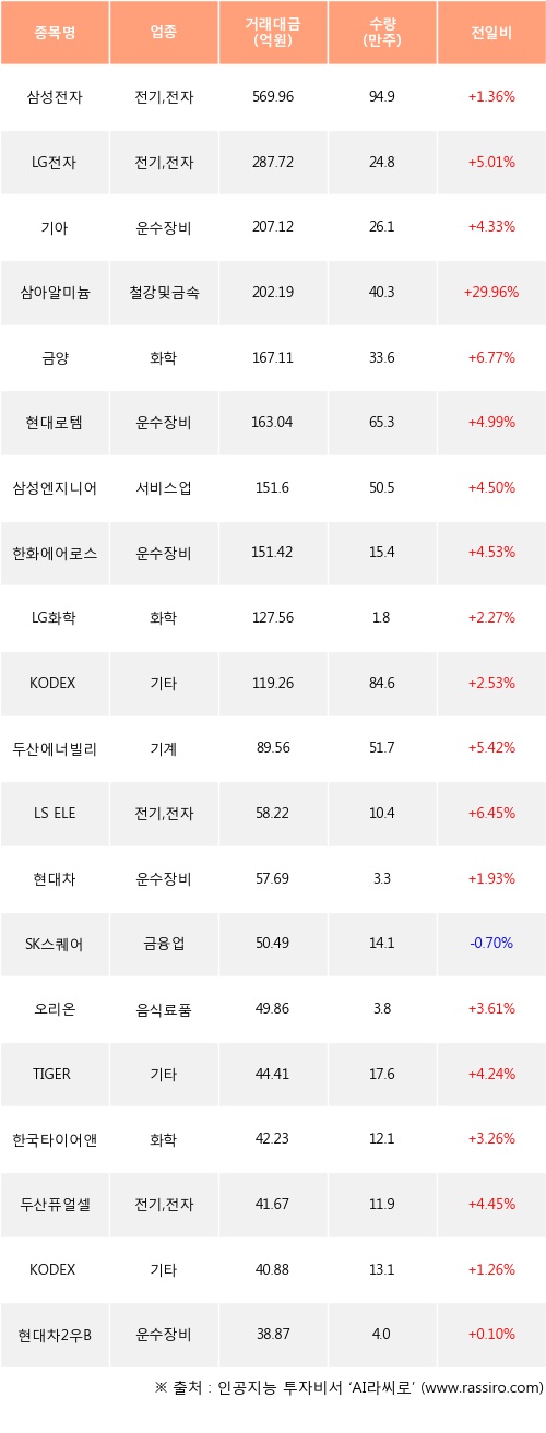 외국인 투자자의 순매수 상위 20개 종목은 삼성전자, LG전자, 기아, 삼아알미늄, 금양, 현대로템, 삼성엔지니어링, 한화에어로스페이스, LG화학, KODEX 레버리지등이다.