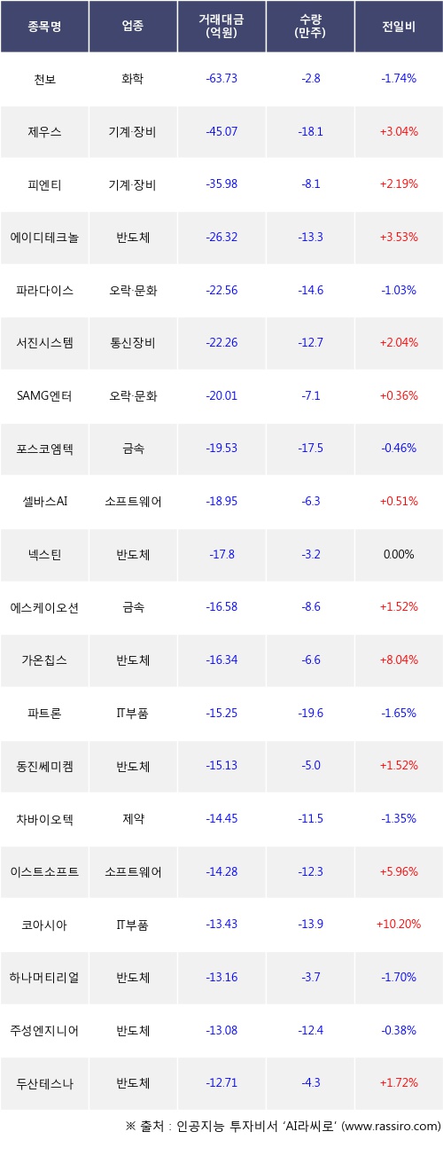 외국인 투자자의 순매도 상위 20개 종목은 천보, 제우스, 피엔티, 에이디테크놀로지, 파라다이스, 서진시스템, SAMG엔터, 포스코엠텍, 셀바스AI, 넥스틴등이다.