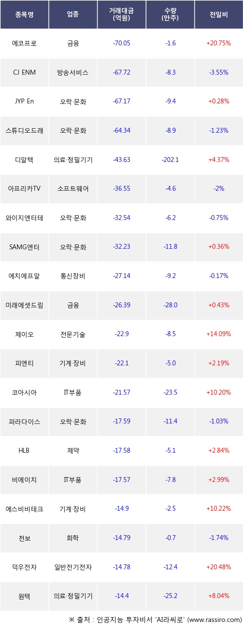 기관 투자자의 순매도 상위 20개 종목은 에코프로, CJ ENM, JYP Ent., 스튜디오드래곤, 디알텍, 아프리카TV, 와이지엔터테인먼트, SAMG엔터, 에치에프알, 미래에셋드림스팩1호등이다.