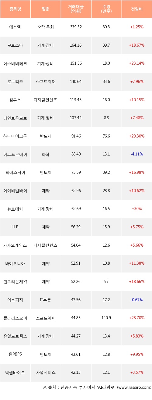 외국인 투자자의 순매수 상위 20개 종목은 에스엠, 로보스타, 에스비비테크, 로보티즈, 컴투스, 레인보우로보틱스, 하나마이크론, 에코프로에이치엔, 피에스케이, 에이비엘바이오등이다.