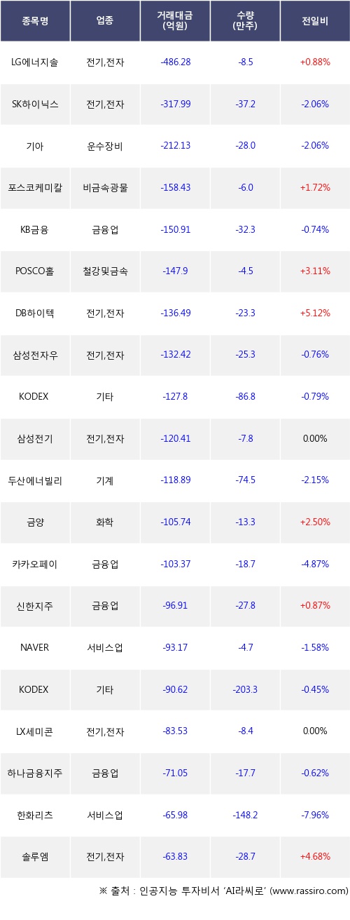 외국인 투자자의 순매도 상위 20개 종목은 LG에너지솔루션, SK하이닉스, 기아, 포스코케미칼, KB금융, POSCO홀딩스, DB하이텍, 삼성전자우, KODEX 레버리지, 삼성전기등이다.