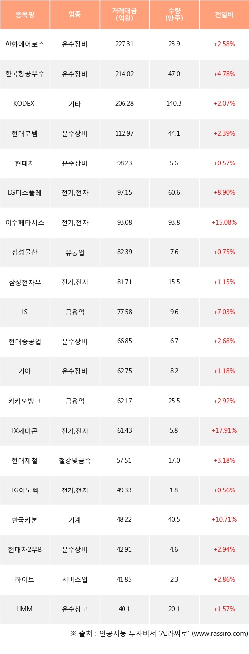 외국인 투자자의 순매수 상위 20개 종목은 한화에어로스페이스, 한국항공우주, KODEX 레버리지, 현대로템, 현대차, LG디스플레이, 이수페타시스, 삼성물산, 삼성전자우, LS등이다.
