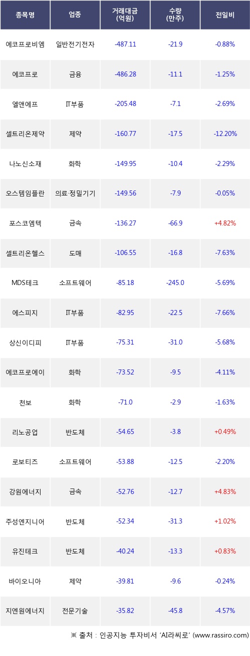 외국인 투자자의 순매도 상위 20개 종목은 에코프로비엠, 에코프로, 엘앤에프, 셀트리온제약, 나노신소재, 오스템임플란트, 포스코엠텍, 셀트리온헬스케어, MDS테크, 에스피지등이다.