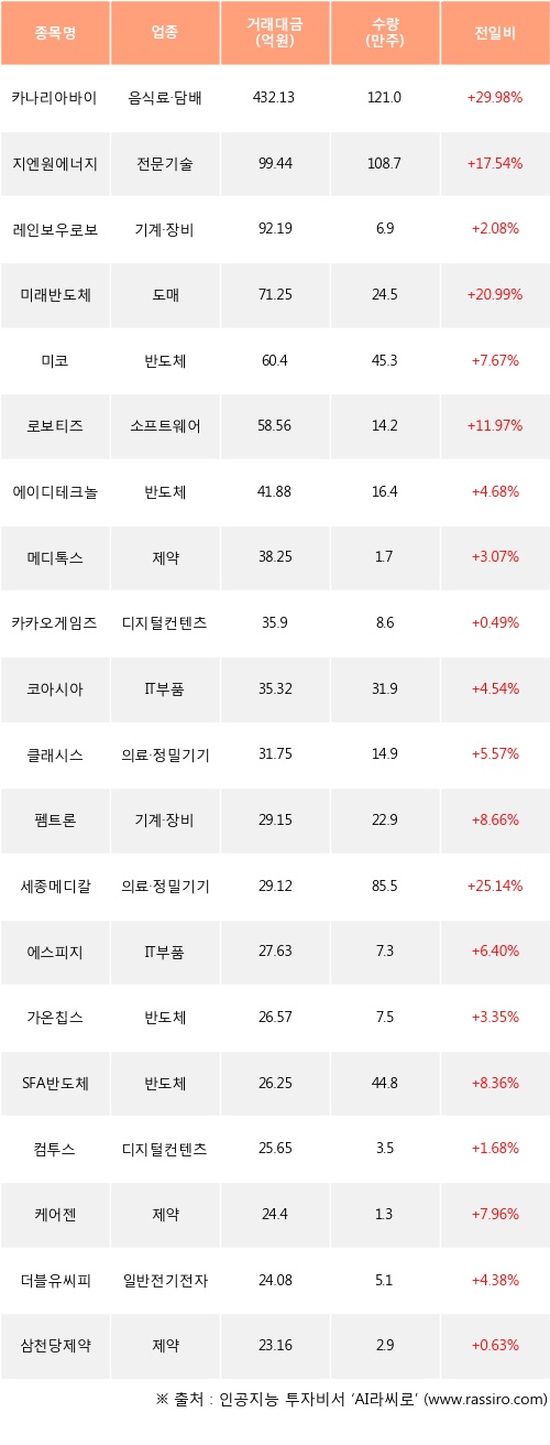 외국인 투자자의 순매수 상위 20개 종목은 카나리아바이오, 지엔원에너지, 레인보우로보틱스, 미래반도체, 미코, 로보티즈, 에이디테크놀로지, 메디톡스, 카카오게임즈, 코아시아등이다.