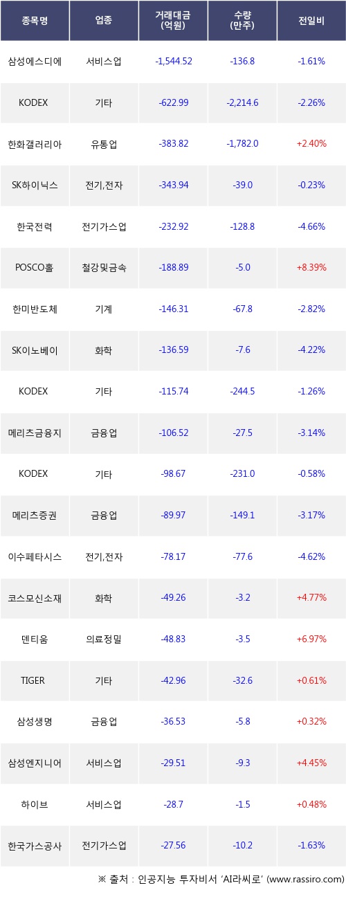 기관 투자자의 순매도 상위 20개 종목은 삼성에스디에스, KODEX 200선물인버스2X, 한화갤러리아, SK하이닉스, 한국전력, POSCO홀딩스, 한미반도체, SK이노베이션, KODEX 인버스, 메리츠금융지주등이다.