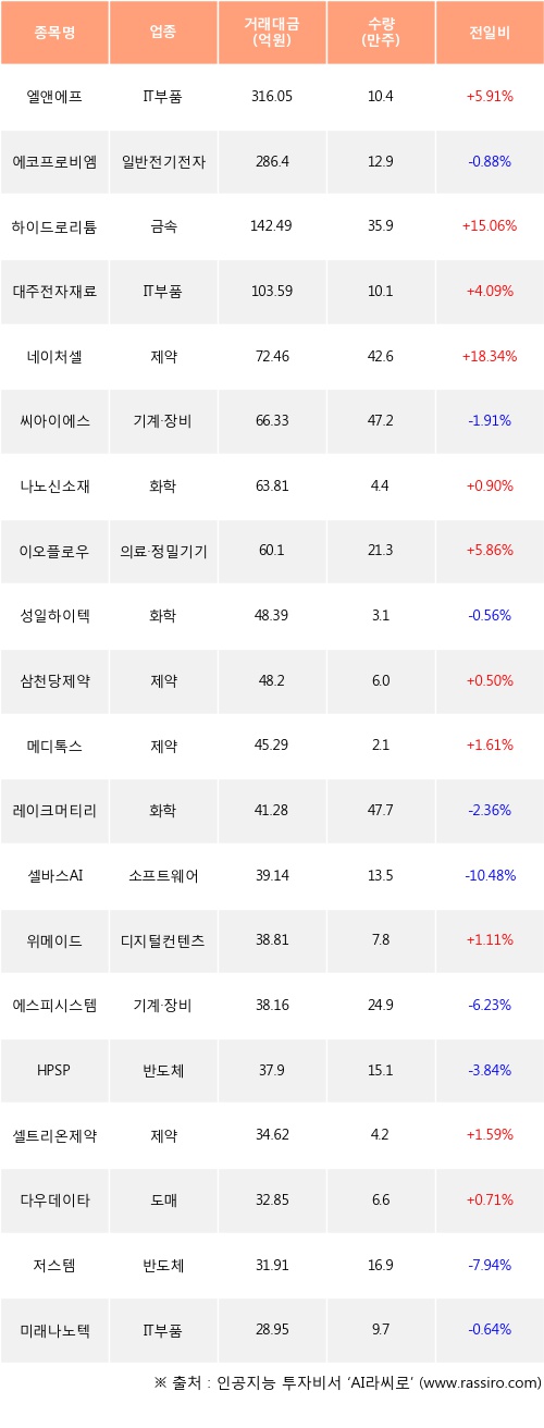 외국인 투자자의 순매수 상위 20개 종목은 엘앤에프, 에코프로비엠, 하이드로리튬, 대주전자재료, 네이처셀, 씨아이에스, 나노신소재, 이오플로우, 성일하이텍, 삼천당제약등이다.