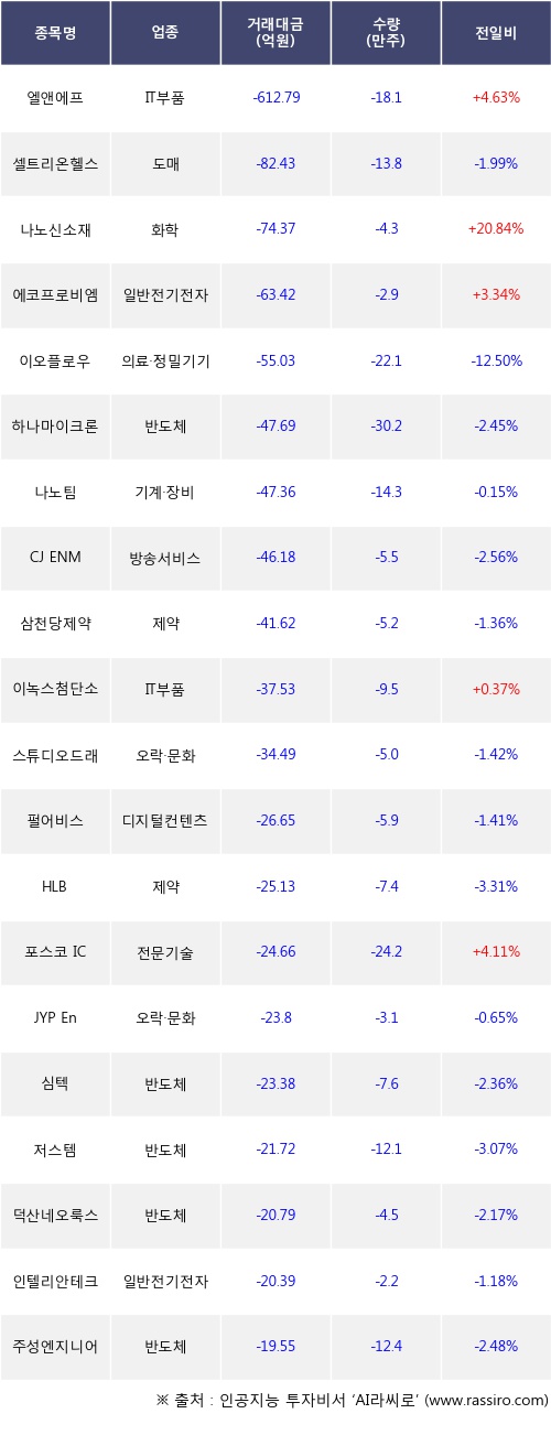 기관 투자자의 순매도 상위 20개 종목은 엘앤에프, 셀트리온헬스케어, 나노신소재, 에코프로비엠, 이오플로우, 하나마이크론, 나노팀, CJ ENM, 삼천당제약, 이녹스첨단소재등이다.