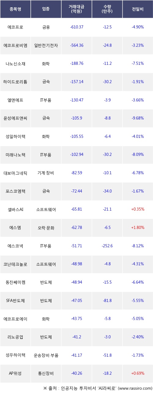 외국인 투자자의 순매도 상위 20개 종목은 에코프로, 에코프로비엠, 나노신소재, 하이드로리튬, 엘앤에프, 윤성에프앤씨, 성일하이텍, 미래나노텍, 대보마그네틱, 포스코엠텍등이다.