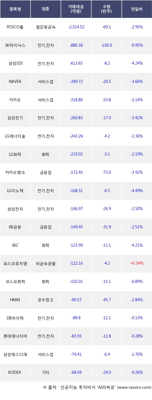 외국인 투자자의 순매도 상위 20개 종목은 POSCO홀딩스, SK하이닉스, 삼성SDI, NAVER, 카카오, 삼성전기, LG에너지솔루션, LG화학, 카카오뱅크, LG이노텍등이다.
