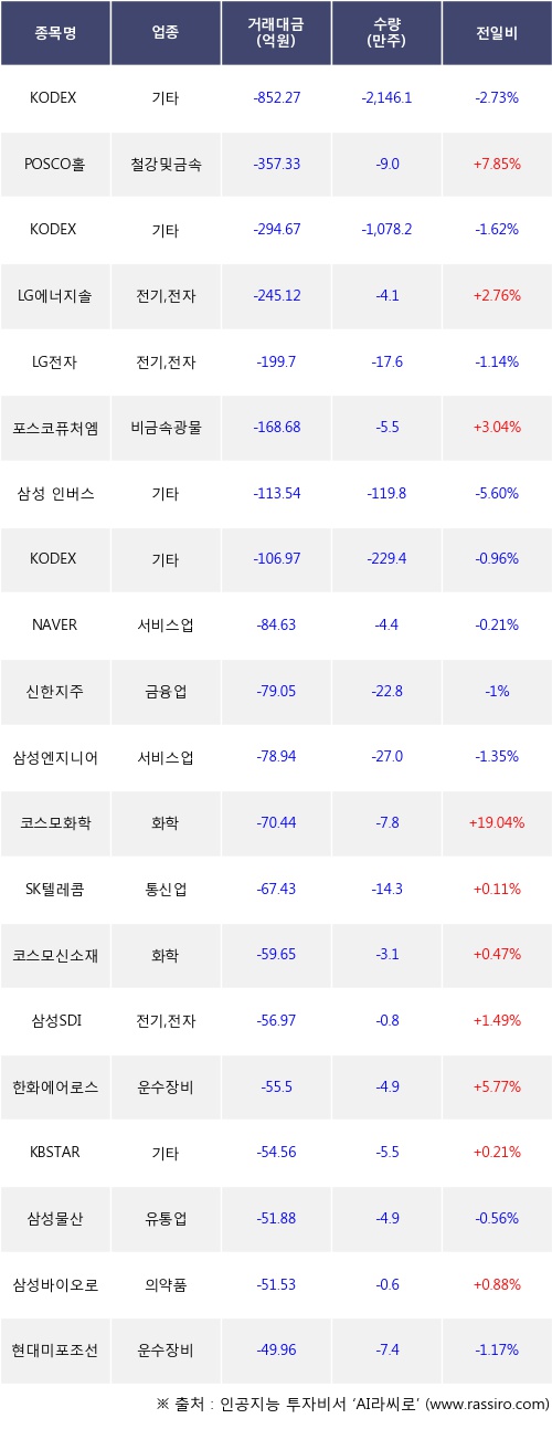 기관 투자자의 순매도 상위 20개 종목은 KODEX 코스닥150선물인버스, POSCO홀딩스, KODEX 200선물인버스2X, LG에너지솔루션, LG전자, 포스코퓨처엠, 삼성 인버스 2X 코스닥150 선물 ETN, KODEX 인버스, NAVER, 신한지주등이다.