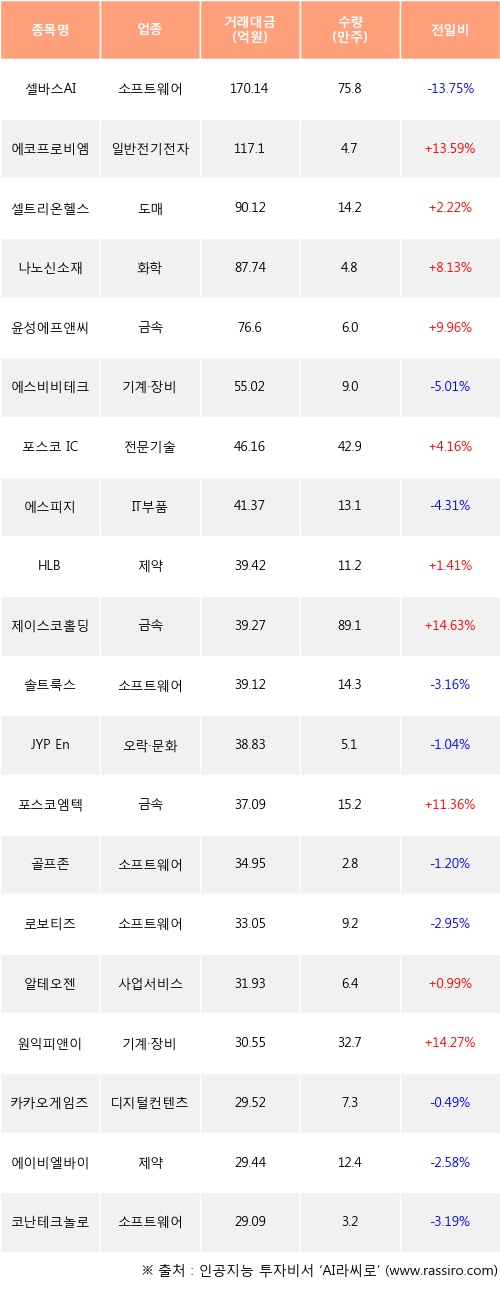 에코프로비엠, 셀트리온헬스케어, 나노신소재 등은 전일 대비 주가가 상승했고, 셀바스AI, 에스비비테크, 에스피지 등은 주가가 하락했다.