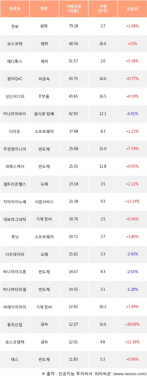천보, 오스코텍, 메디톡스 등은 전일 대비 주가가 상승했고, 카나리아바이오, 다우데이타, 하나마이크론 등은 주가가 하락했다.