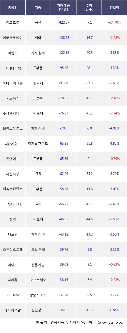 외국인 투자자의 순매도 상위 20개 종목은 에코프로, 에코프로에이치엔, 피엔티, 미래나노텍, 하나마이크론, 새로닉스, 주성엔지니어링, 레인보우로보틱스, 넥슨게임즈, 엘앤에프등이다.