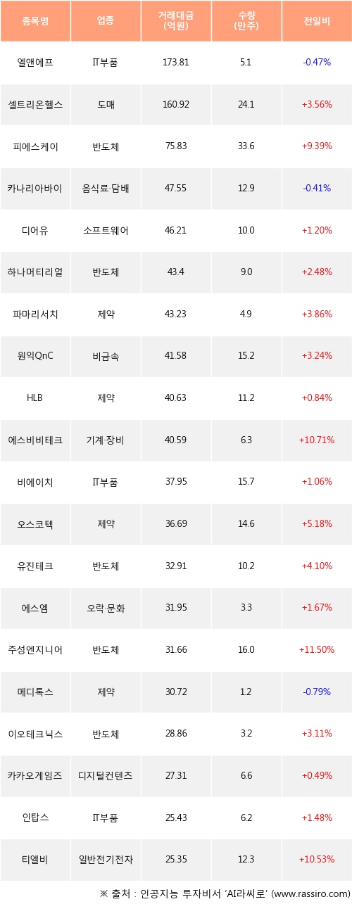 셀트리온헬스케어, 피에스케이, 디어유 등은 전일 대비 주가가 상승했고, 엘앤에프, 카나리아바이오, 메디톡스 등은 주가가 하락했다.
