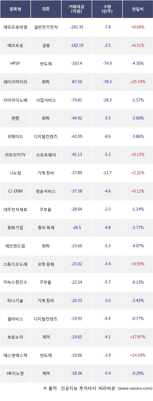 기관 투자자의 순매도 상위 20개 종목은 에코프로비엠, 에코프로, HPSP, 레이크머티리얼즈, 지아이이노베이션, 엔켐, 위메이드, 아프리카TV, 나노팀, CJ ENM등이다.