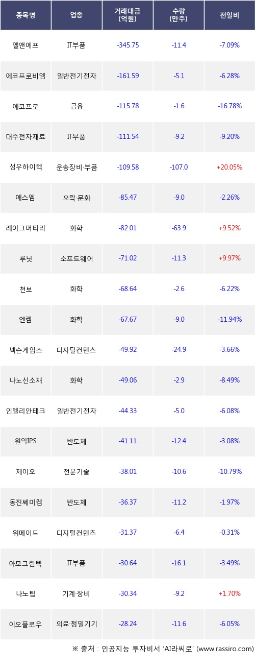 기관 투자자의 순매도 상위 20개 종목은 엘앤에프, 에코프로비엠, 에코프로, 대주전자재료, 성우하이텍, 에스엠, 레이크머티리얼즈, 루닛, 천보, 엔켐등이다.