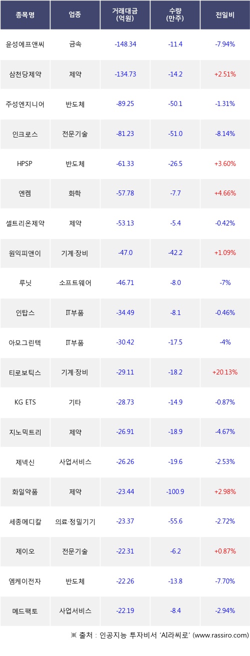 외국인 투자자의 순매도 상위 20개 종목은 윤성에프앤씨, 삼천당제약, 주성엔지니어링, 인크로스, HPSP, 엔켐, 셀트리온제약, 원익피앤이, 루닛, 인탑스등이다.