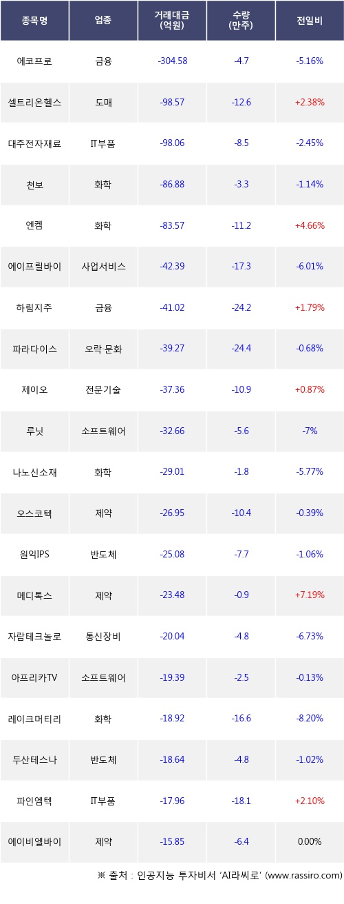 기관 투자자의 순매도 상위 20개 종목은 에코프로, 셀트리온헬스케어, 대주전자재료, 천보, 엔켐, 에이프릴바이오, 하림지주, 파라다이스, 제이오, 루닛등이다.