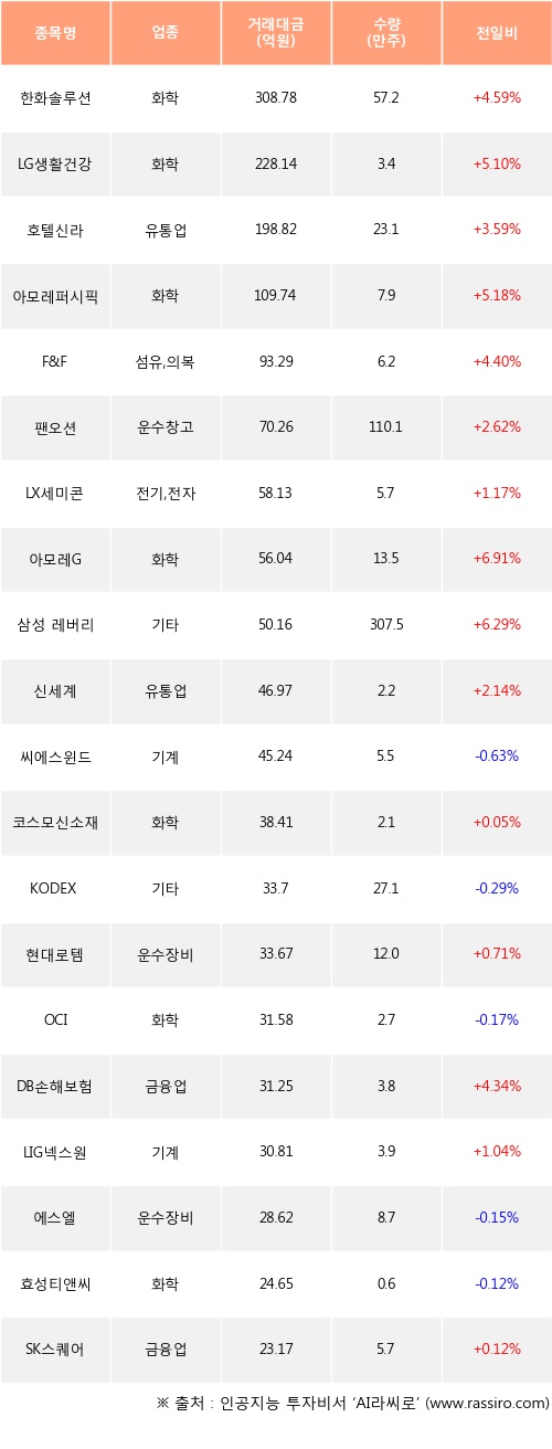 한화솔루션, LG생활건강, 호텔신라 등은 전일 대비 주가가 상승했고, 씨에스윈드, KODEX 코스닥150레버리지, OCI 등은 주가가 하락했다.