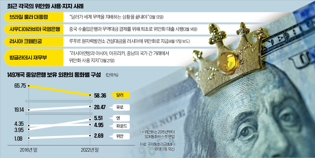 러시아도 우크라이나 전쟁을 계기로 위안화 중심 체제에 힘을 싣고 있다. 바실리 네벤지아 유엔 주재 러시아 대사는 3일 안전보장이사회 의장국을 맡으며 “러시아 제재로 달러 기반 국제 지급 시스템의 신뢰성에 대한 우려가 제기됐다”며 “이제 세계 경제를 ‘탈달러화’할 때”라고 밝혔다. 블라디미르 푸틴 러시아 대통령은 지난달 시진핑 중국 국가주석과의 정상회담에서 “러시아를 비롯해 아시아, 아프리카, 라틴아메리카 국가 간 거래에서 위안화 사용을 지지한다”고 말했다.