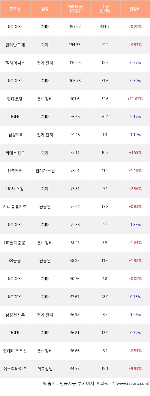 KODEX 인버스, 한미반도체, 현대로템 등은 전일 대비 주가가 상승했고, SK하이닉스, KODEX 200, TIGER 2차전지테마 등은 주가가 하락했다.