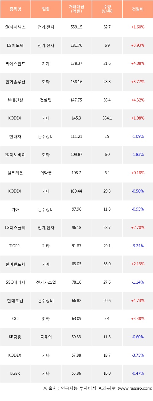 SK하이닉스, LG이노텍, 씨에스윈드 등은 전일 대비 주가가 상승했고, 현대차, SK이노베이션, KODEX 200 등은 주가가 하락했다.