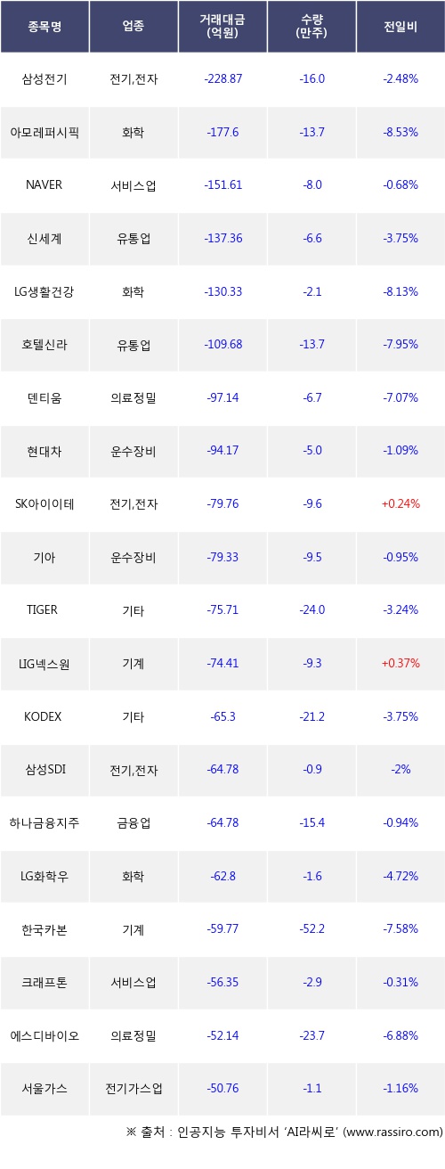 외국인 투자자의 순매도 상위 20개 종목은 삼성전기, 아모레퍼시픽, NAVER, 신세계, LG생활건강, 호텔신라, 덴티움, 현대차, SK아이이테크놀로지, 기아등이다.