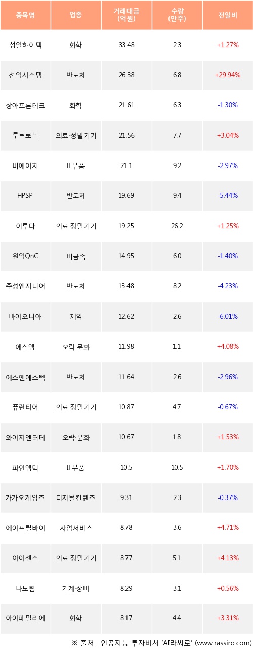 기관 투자자의 순매수 상위 20개 종목은 성일하이텍, 선익시스템, 상아프론테크, 루트로닉, 비에이치, HPSP, 이루다, 원익QnC, 주성엔지니어링, 바이오니아등이다.