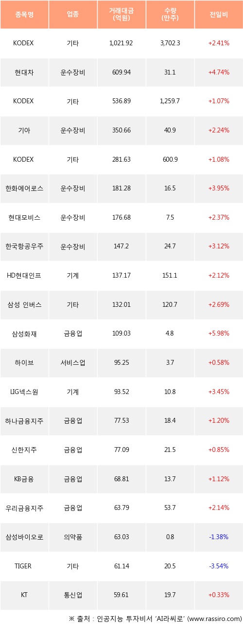 KODEX 200선물인버스2X, 현대차, KODEX 코스닥150선물인버스 등은 전일 대비 주가가 상승했고, 삼성바이오로직스, TIGER 2차전지테마 등은 주가가 하락했다.