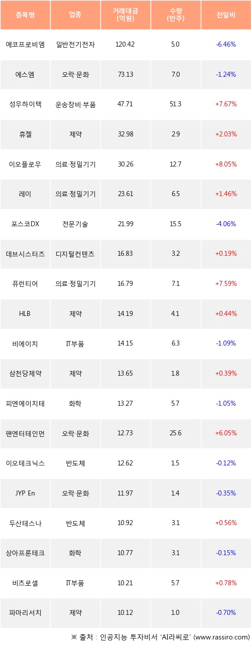 성우하이텍, 휴젤, 이오플로우 등은 전일 대비 주가가 상승했고, 에코프로비엠, 에스엠, 포스코DX 등은 주가가 하락했다.