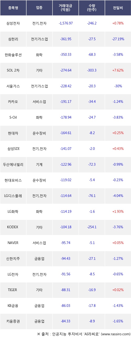 기관 투자자의 순매도 상위 20개 종목은 삼성전자, 삼천리, 한화솔루션, SOL 2차전지소부장Fn, 서울가스, 카카오, S-Oil, 현대차, 삼성SDI, 두산에너빌리티등이다.