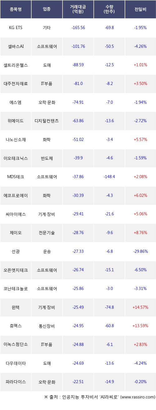외국인 투자자의 순매도 상위 20개 종목은 KG ETS, 셀바스AI, 셀트리온헬스케어, 대주전자재료, 에스엠, 위메이드, 나노신소재, 이오테크닉스, MDS테크, 에코프로에이치엔등이다.