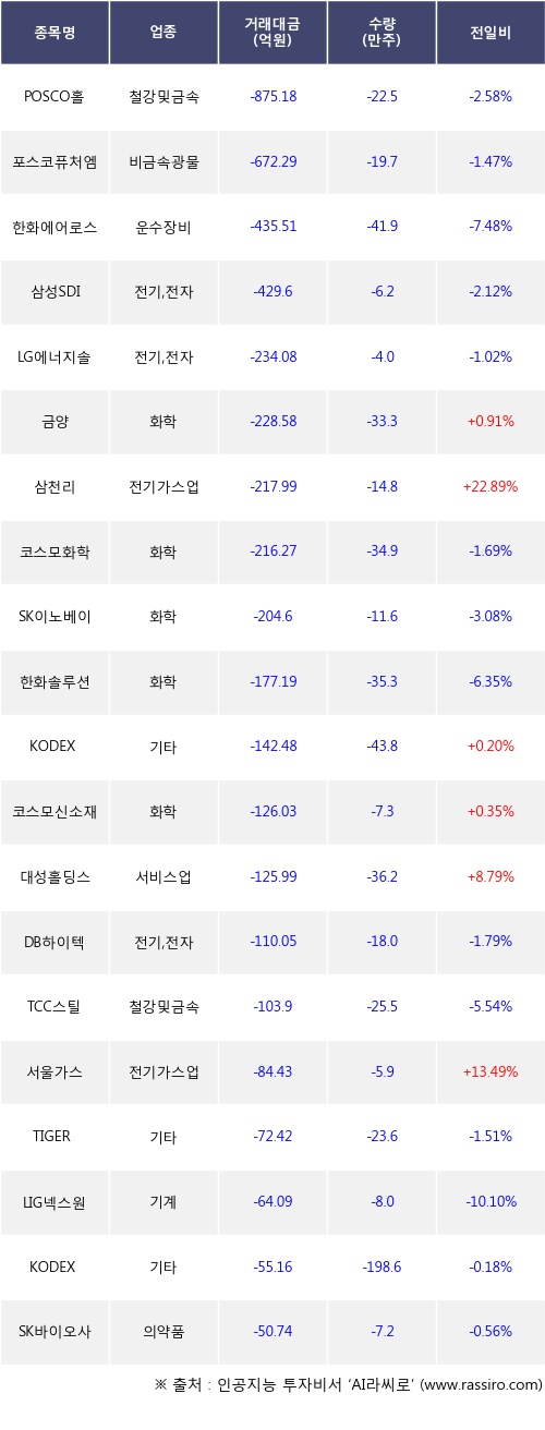 외국인 투자자의 순매도 상위 20개 종목은 POSCO홀딩스, 포스코퓨처엠, 한화에어로스페이스, 삼성SDI, LG에너지솔루션, 금양, 삼천리, 코스모화학, SK이노베이션, 한화솔루션등이다.
