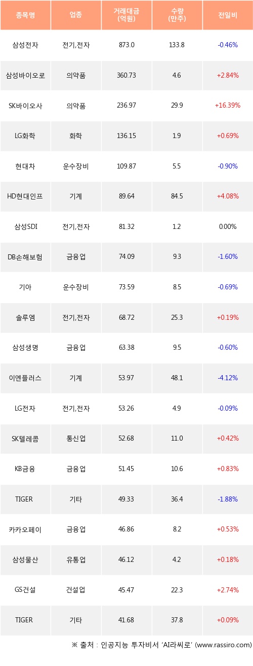 외국인 투자자의 순매수 상위 20개 종목은 삼성전자, 삼성바이오로직스, SK바이오사이언스, LG화학, 현대차, HD현대인프라코어, 삼성SDI, DB손해보험, 기아, 솔루엠등이다.