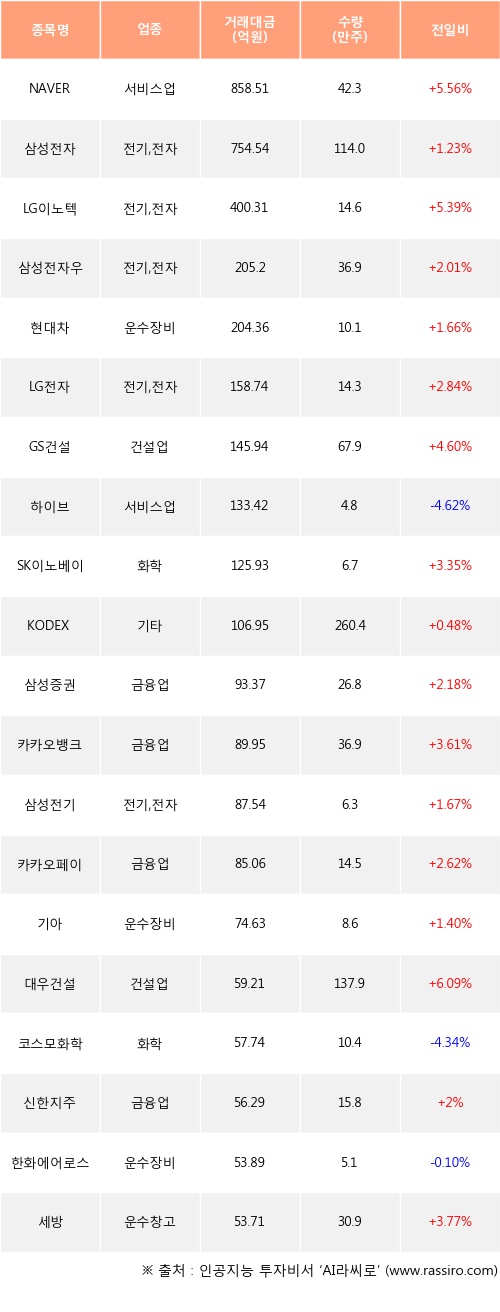 외국인 투자자의 순매수 상위 20개 종목은 NAVER, 삼성전자, LG이노텍, 삼성전자우, 현대차, LG전자, GS건설, 하이브, SK이노베이션, KODEX 코스닥150선물인버스등이다.
